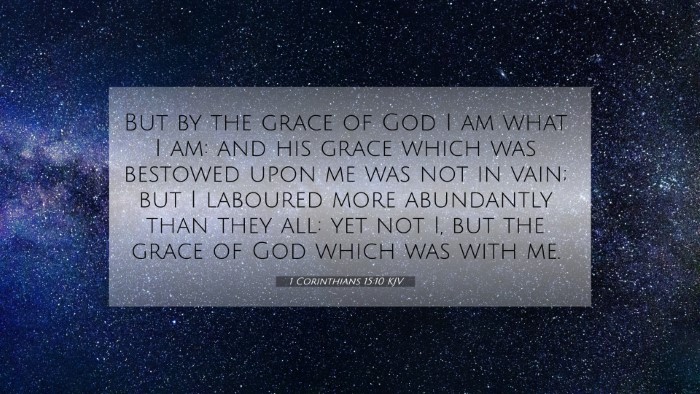 1 Corinthians 15:10 serves as a powerful reminder of the essential nature of grace in the life of believers. By integrating commentaries and cross-references, one can appreciate the interconnectedness of scripture and gain deeper insights into God’s grace and our corresponding labor. This verse encourages not only reflection on grace but also inspires action in living out one's faith with diligence and humility, demonstrating the profound impact of God's grace in transforming lives for His glory.