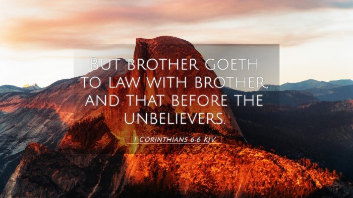 1 Corinthians 6:6 serves as a reminder to Christians of the importance of maintaining a cordial and forgiving spirit, avoiding the public jurisdiction of worldly institutions for resolutions that are meant to be handled within the church. Such behavior not only honors God but also strengthens the testimony of the church in the eyes of the world.