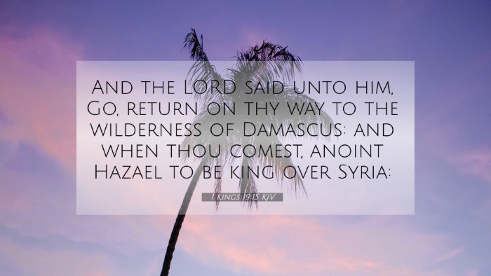 1 Kings 19:15 serves as a profound reminder of God's ongoing authority and the importance of prophetic leadership throughout the Scriptures. For deeper understanding, consider using tools for Bible cross-referencing, such as a Bible concordance or insightful studies on thematic connections.