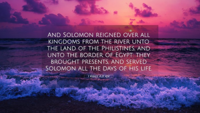 1 Kings 4:21 is rich with implications regarding authority, wisdom, and the fulfillment of divine promises. By examining associated commentaries and cross-references, one can appreciate the grandeur of Solomon’s rule and its biblical significance. This verse stands as a beacon of international influence and spiritual fulfillment, amplifying the understanding of both the Old and New Testaments.