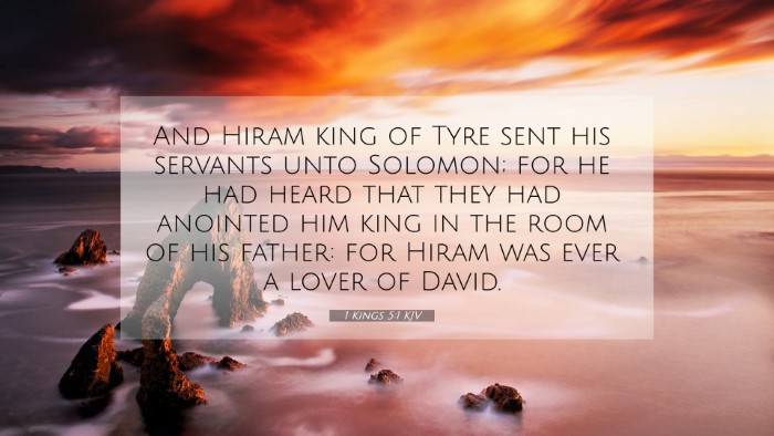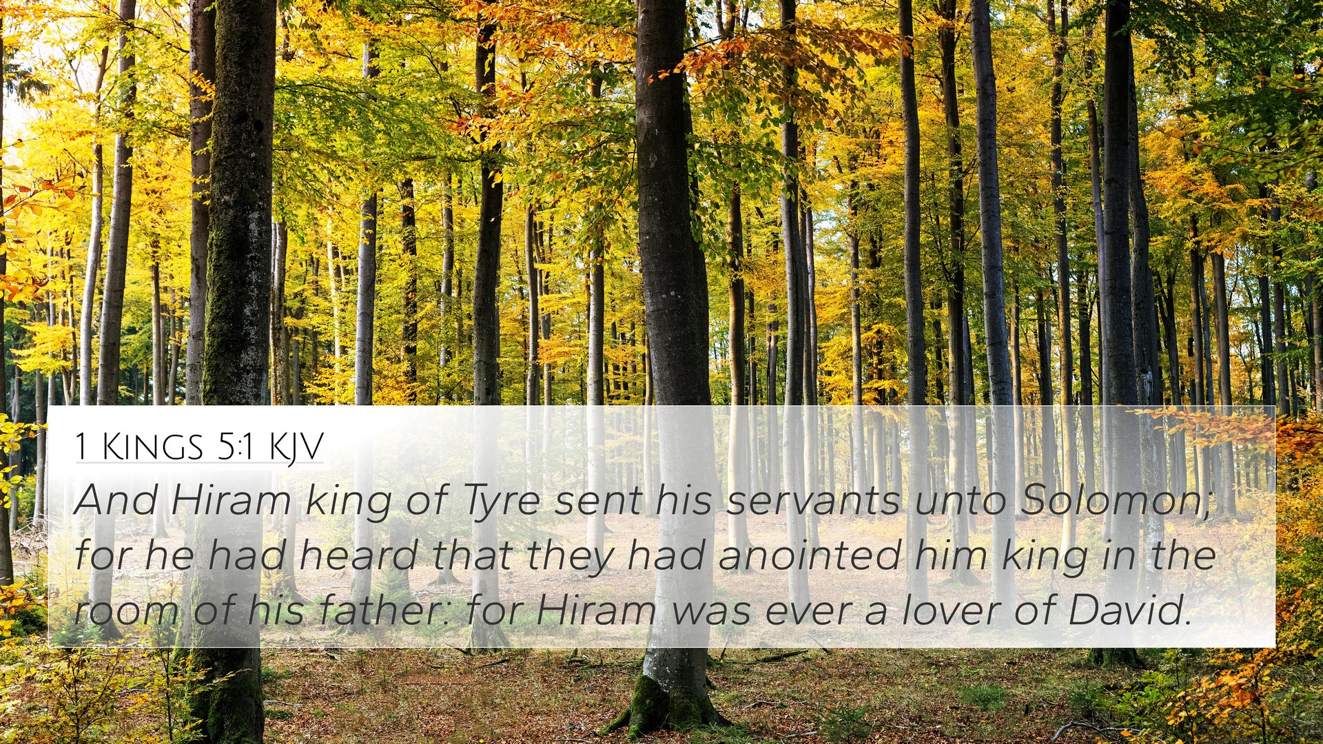 The verse 1 Kings 5:1 states: "And Hiram king of Tyre sent his servants unto Solomon; for he had heard that they had anointed him king in the room of his father: for Hiram was ever a lover of David."