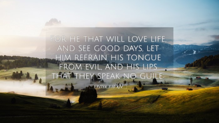To summarize, 1 Peter 3:10 provides profound insight into living a life characterized by love, integrity, and the value of speaking truthfully. The connections between this verse and various other scriptures highlight the universal nature of these teachings. By engaging with these themes through cross-referencing, believers can deepen their understanding and application of Biblical principles in their lives.