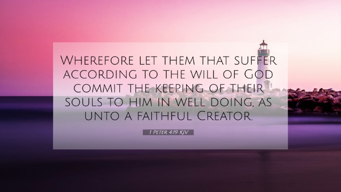 Clarke points out that the phrase "keeping of their souls" indicates a conscious choice to rely on God’s guidance throughout hardship. He interprets "as unto a faithful Creator" as an acknowledgment of God’s sovereignty and reliability.