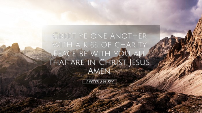 1 Peter 5:14 serves as a poignant reminder of the relational aspect of the Christian faith. Through affection, greeting, and the pursuit of peace, believers embody the love of Christ in their communities. The cross-references provided further elaborate on this theme, showing how interconnected the teachings of the Bible are when it comes to the love shared among Christians.