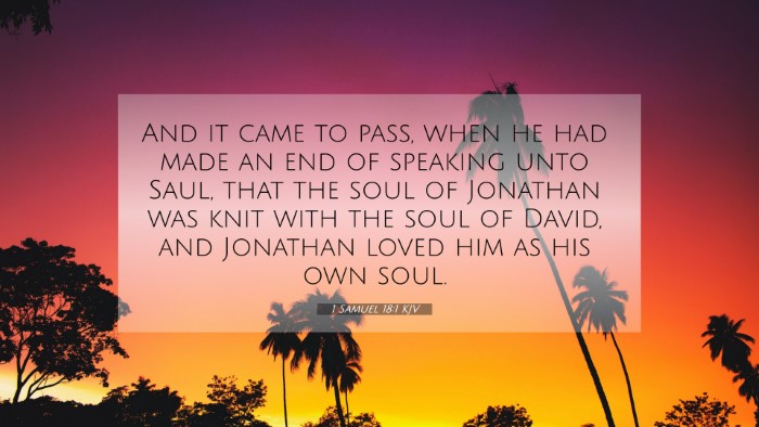 This verse marks a pivotal moment in the narrative of the early relationship between David and Jonathan, characterized by a profound bond. Various public domain commentaries provide insights into its thematic depth and cultural significance.