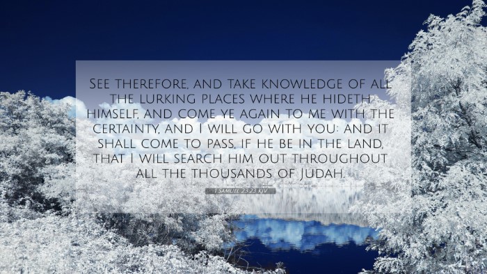 In summary, 1 Samuel 23:23 illustrates the strategic foresight and reliance on divine guidance in the face of adversity. As seen through the various commentaries, the reflective nature of David’s actions grants deeper understanding in the context of Biblical leadership and the pursuit of God’s will amidst trials. Cross-referencing allows for rich engagement with scripture, encouraging believers to find strength and direction in their faith journeys.