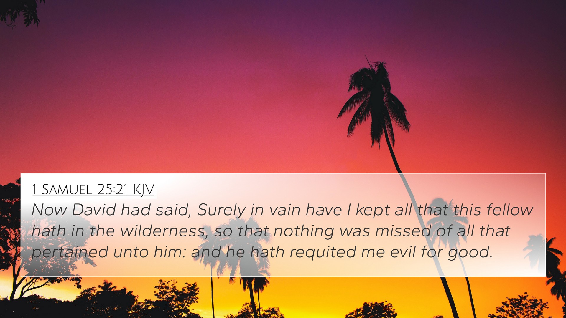 1 Samuel 25:21 states: "Now David had said, 'Surely in vain I have guarded all that this fellow has in the wilderness, so that nothing was missed of all that belongs to him. And he has repaid me evil for good.'" This verse captures a significant moment in the narrative surrounding David's interactions with Nabal, highlighting themes of betrayal and the complexities of human relationships.