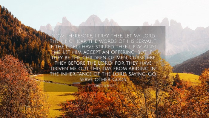 Below, you will find carefully selected verses that echo the themes and teachings related to 1 Samuel 26:19 KJV. Click on any image to explore detailed analyses of related Bible verses and uncover deeper theological insights.