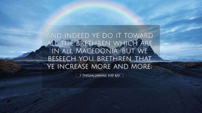 1 Thessalonians 4:10 encapsulates a critical aspect of Christian life: love must be constant and expanding. As believers, we are called not just to love but to excel in love towards others, reflecting Christ's love in our communities and beyond. By utilizing the interconnectedness of Scripture through cross-referencing, we can gain a fuller understanding of God's message and intentions for His people.