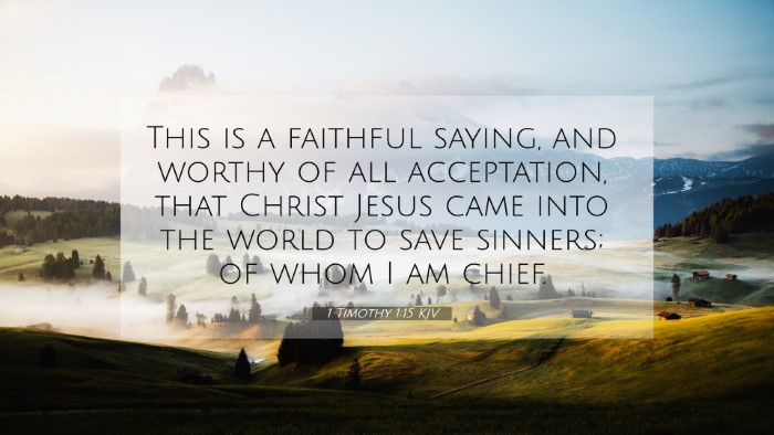 Barnes discusses the importance of this statement as a trustworthy saying. He points to the universality of sin and Christ's redemptive purpose as the foundation for hope. He elaborates on the implications of recognizing oneself as the worst of sinners, which drives one to deeper appreciation for God's grace.