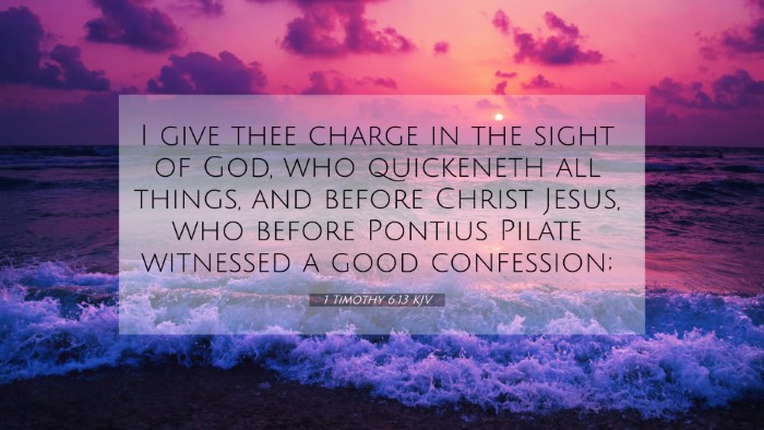 Henry highlights the gravity of the charge Timothy receives. It emphasizes being conscious of God's omnipresence and the necessity of maintaining a faithful testimony like that of Christ before Pilate. This connection serves as a reminder of the trials and tribulations faced by believers.