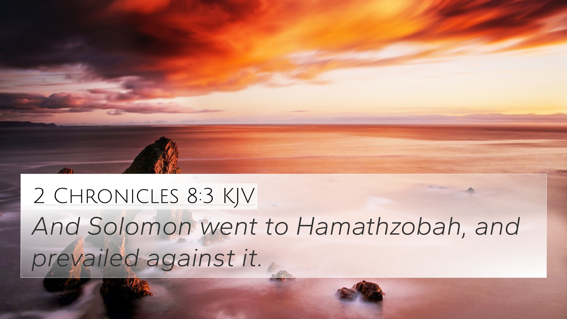 Verse Reference: 2 Chronicles 8:3 (KJV): "And Solomon went to Hamathzobah, and prevailed against it."