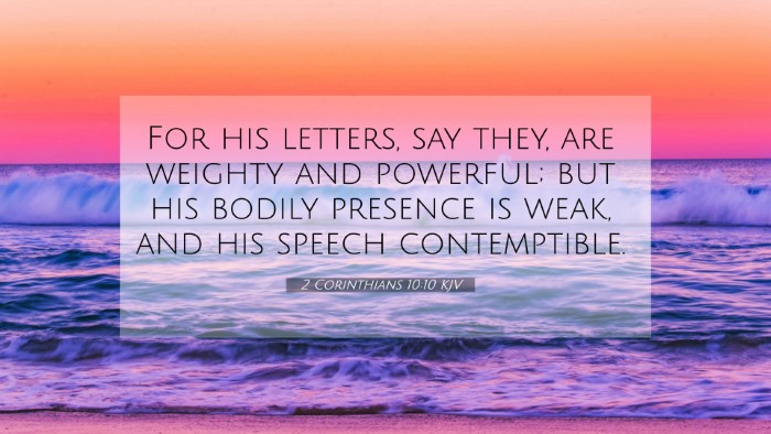 Barnes elaborates on the irony of human judgment; outward appearances often fail to reflect true spiritual strength. He encourages readers to focus on the substance of Paul’s message rather than his physical weaknesses, establishing a precedent for evaluating spiritual leadership.