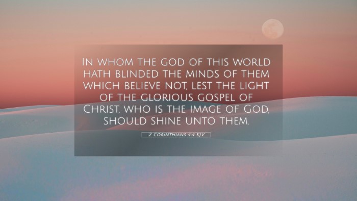 Below, you will find carefully selected verses that echo the themes and teachings related to 2 Corinthians 4:4 KJV. Click on any image to explore detailed analyses of related Bible verses and uncover deeper theological insights.