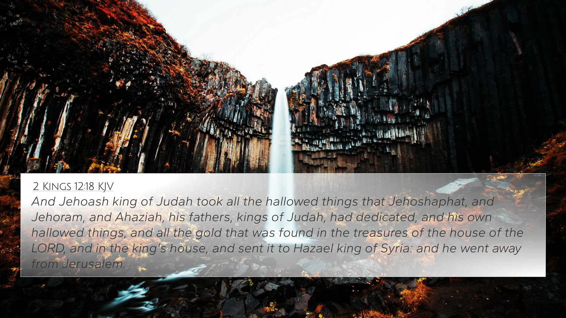 Verse Context: 2 Kings 12:18 states, "And Jehoash king of Judah took all the hallowed things that his fathers, and Jehoshaphat, and Ahaziah, kings of Judah, had dedicated, and the hallowed things which he himself had dedicated, and all the gold that was found in the treasures of the house of the LORD, and in the king's house, and sent it to Hazael king of Syria; and he went up and fought against Gath, and took it." This verse is pivotal during a time of political unrest and spiritual revival in Judah.