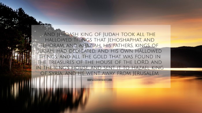 Matthew Henry's Commentary: Henry notes that Jehoash's actions were motivated by a desire to secure protection and strength for his kingdom. He emphasizes the importance of dedicating treasures to the Lord and how the king's willingness to leverage sacred items for worldly defense showcases both faith and folly. He also discusses the relationship between obedience to God’s will and the outcomes in political contexts.