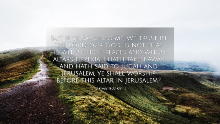 - Albert Barnes' Notes: Barnes emphasizes the significance of the assertion made by the Assyrians regarding the actions of Hezekiah. The verse serves to question the legitimacy of Hezekiah’s reforms, showcasing a tension between faithfulness to God's commands and the prevailing views of surrounding nations. This passage illustrates the challenges believers face when their faith is questioned.