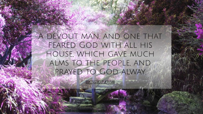 Acts 10:2 states: "A devout man, and one that feared God with all his house, which gave much alms to the people, and prayed to God alway." This verse introduces Cornelius, a Gentile centurion, highlighting his piety and sincere devotion to God. In this summary, we will explore the meaning of this verse through insights from renowned public domain commentaries.