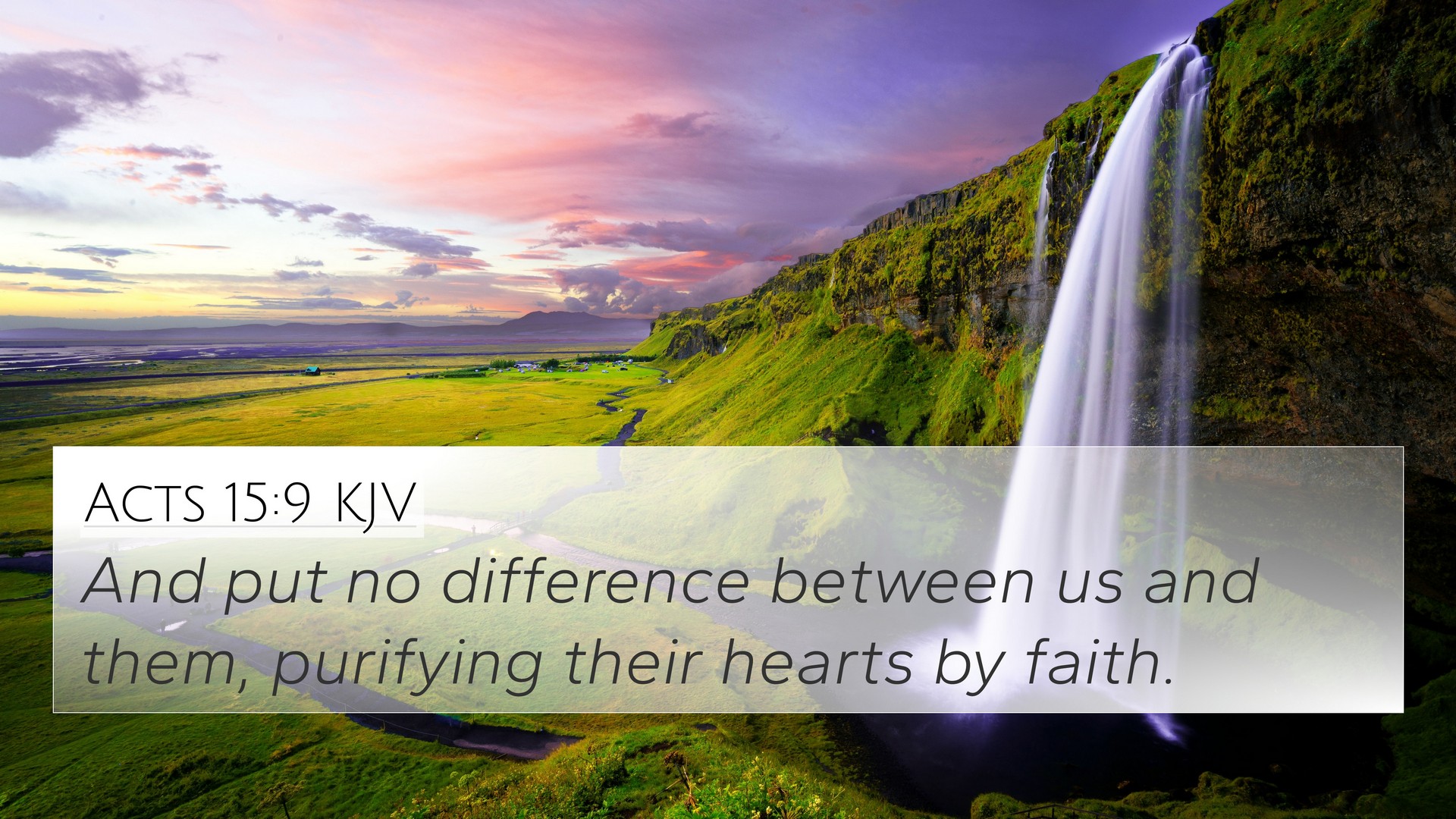 Albert Barnes explains that the early church leaders recognized that faith was the means of achieving purity before God. He notes that the phrase "purifying their hearts by faith" suggests a transformative process that is purely of divine origin. Barnes further asserts this verse affirms that both Jews and Gentiles are equally accepted into the fold of God, reinforcing the principle of grace over law.