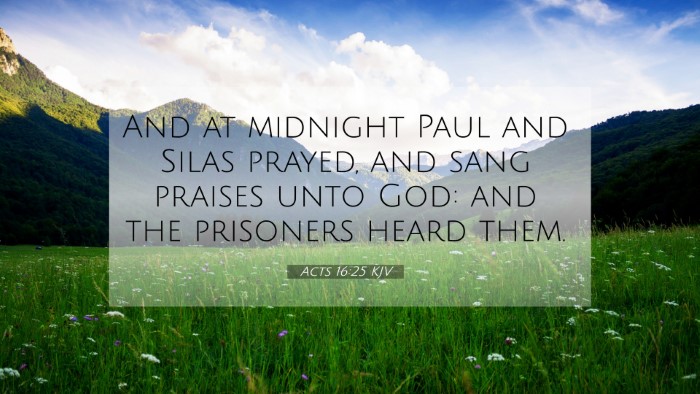 Albert Barnes points out the significance of the time of their prayers, midnight—a symbol of despair and hopelessness. They turned to prayer rather than complaining about their plight, demonstrating that prayer is a source of strength. He also stresses the effects of their actions, as they not only prayed but sang praises, drawing attention to the importance of worship in altering one's spiritual atmosphere. Their singing served as a witness to those around them.