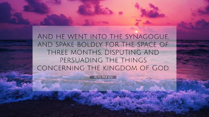 Below, you will find carefully selected verses that echo the themes and teachings related to Acts 19:8 KJV. Click on any image to explore detailed analyses of related Bible verses and uncover deeper theological insights.