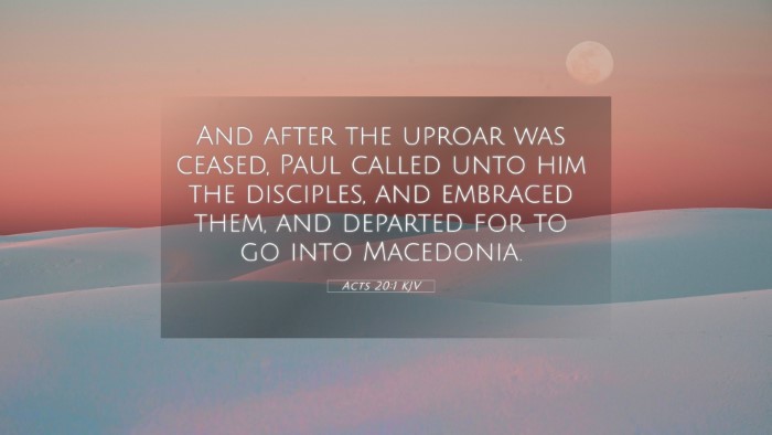 Acts 20:1 states, "And after the uproar was ceased, Paul called unto him the disciples, and embraced them, and departed for to go into Macedonia." This verse captures a moment of transition in the Apostolic ministry of Paul, providing rich insights into community, leadership, and the continuity of faith amidst turmoil.