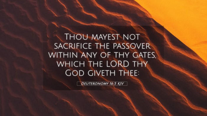 In summary, Deuteronomy 16:5 serves as a reminder of the importance of worshiping in the manner prescribed by God, fostering a strong understanding of community, sacrifice, and devotion. The interconnectedness of this verse with others highlights a rich tradition of worship that transcends time.