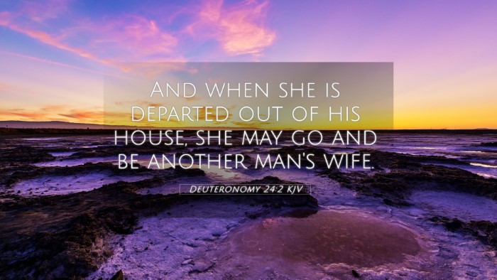 Deuteronomy 24:2 offers profound insights into the workings of divorce, marriage, and the dignity of women in the eyes of God. By examining this verse through various commentaries and cross-referencing other biblical texts, readers can gain a more comprehensive understanding of the themes surrounding marriage, justice, and the moral considerations that emerge throughout the scriptural narrative.