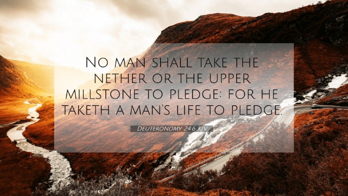 This verse serves as a reminder of the moral obligations we have toward others, particularly in matters of debt and collateral. The act of taking essential tools, such as a millstone, can significantly impact a person's ability to sustain themselves and their family. Here are some insights drawn from various public domain commentaries: