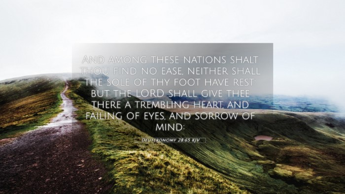 Deuteronomy 28:65 serves as a powerful reminder of the spiritual and emotional ramifications of disobedience to God. Exploring this verse through public domain commentaries like those by Matthew Henry, Albert Barnes, and Adam Clarke, along with cross-referencing it with related scriptures, allows for a deeper understanding of its profound significance in the biblical narrative.