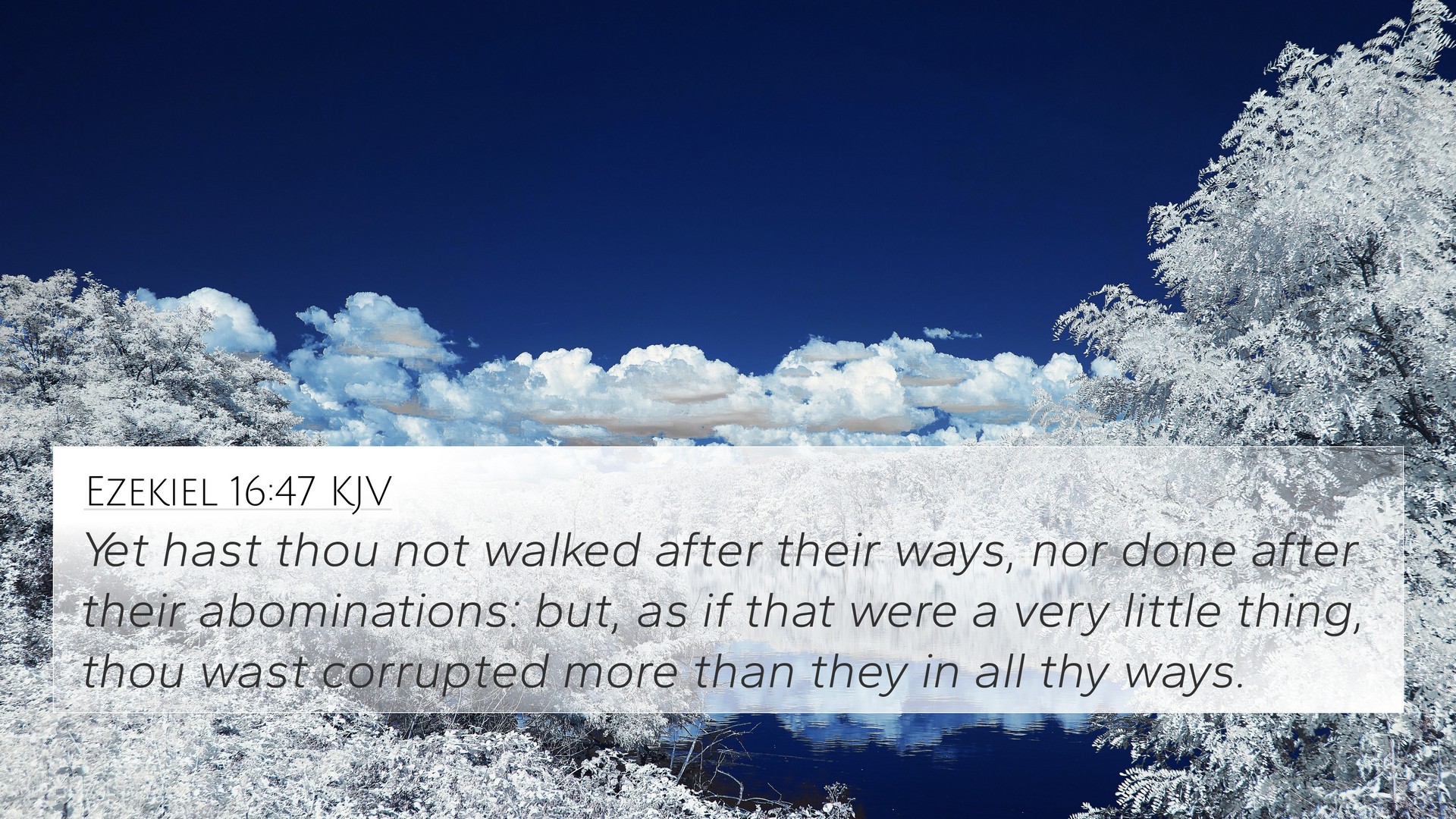 Ezekiel 16:47 states: "Thou hast not walked after their ways, neither done after their abominations: but, as if that were a very little thing, thou wast corrupted more than they in all thy ways." This verse reflects profound themes of judgment, corruption, and accountability, encapsulating the spiritual condition of Jerusalem and her people in the sight of God. Understanding this verse requires careful analysis and cross-referencing with other biblical texts. Below is a combined insight from renowned public domain commentaries including those by Matthew Henry, Albert Barnes, and Adam Clarke.