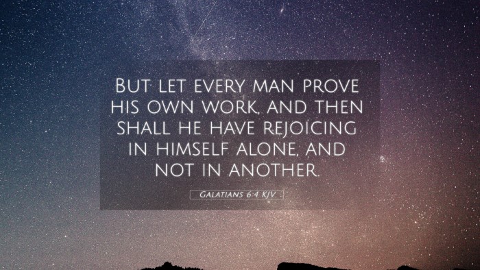 Galatians 6:4 serves as a profound reminder of the importance of self-reflection and personal accountability within the Christian walk. It calls believers to focus on their own spiritual growth and the joy that comes from a sincere relationship with God, free from the burdens of comparison. Through various scriptures, the themes of individual responsibility and the joy of rightly assessing one's works are further amplified. By engaging with these biblical insights and tools, believers can grow deeper in their understanding of the Scriptures and strengthen their faith.
