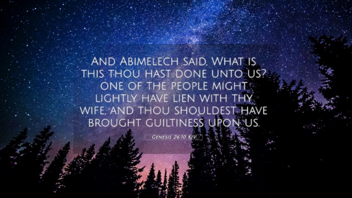This verse occurs within the broader narrative of Isaac's life and the challenges he faced in the land of Gerar. The interactions between Isaac and Abimelech underscore key themes of morality, fidelity, and the consequences of deceit, which resonate throughout the Scriptures.