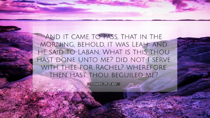 Genesis 29:25 states: "And it came to pass, that in the morning, behold, it was Leah: and he said to Laban, What is this thou hast done unto me? did not I serve with thee for Rachel? wherefore then hast thou beguiled me?" This verse presents a pivotal moment in the life of Jacob, highlighting themes of deception, expectation, and the unfolding of God's providential plans.
