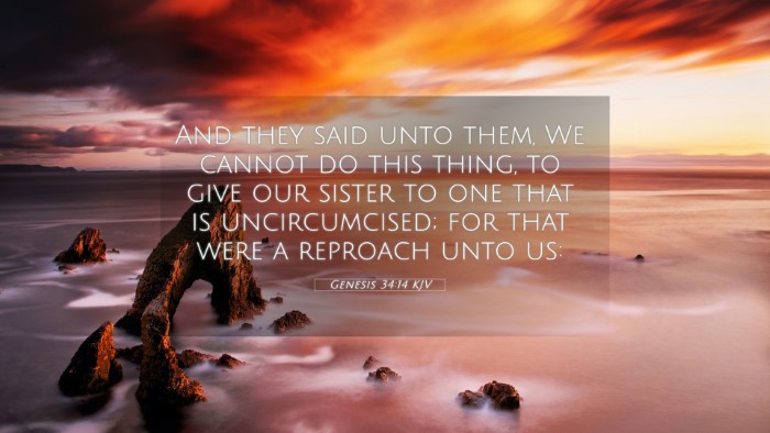 Genesis 34:14 presents a scenario where the sons of Jacob confront the men of Shechem regarding the seduction of their sister Dinah. This verse deals with themes of honor, justice, and the consequences of sin. In analyzing this text, we can draw insights from various public domain commentaries, providing an enriched understanding of its implications and connections.