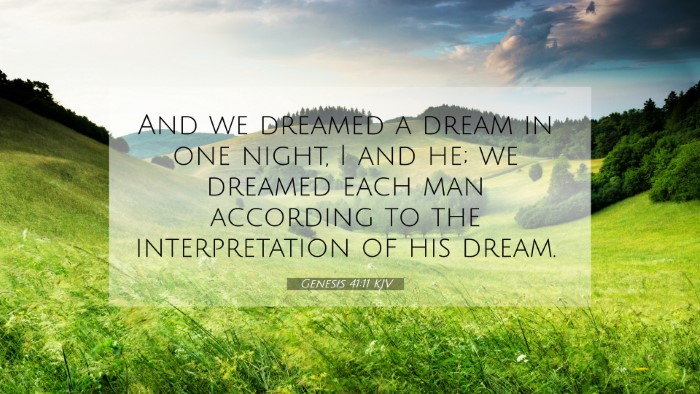 Genesis 41:11 serves as a pivotal moment in the Biblical narrative, illustrating how dreams can serve as a communication tool between God and humanity. The interpretations offered highlight the necessity of divine insight, affirming Joseph's role as an instrument of God's will. The interconnectedness of Scripture teaches us profound truths about God’s nature and His plans for humanity through the lens of dream interpretations, enhancing our understanding through cross-references that echo throughout the Bible.