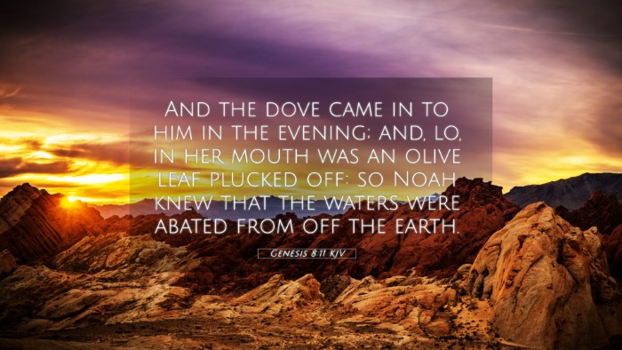 Genesis 8:11 serves not only as a key moment in Noah's story but as a profound illustration of hope, renewal, and God’s love for creation. By utilizing various cross-referencing techniques and recognizing the thematic connections within the scripture, readers can deepen their understanding of divine promises and the ongoing dialogue between God and humanity.