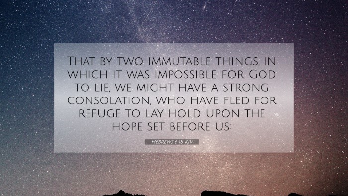 - The Nature of God's Promises: The "two immutable things" refer to God's promise and His oath, which serve as a foundation for the believer's confidence. Matthew Henry notes that this emphasizes the unchangeable nature of God's word and His faithful character.