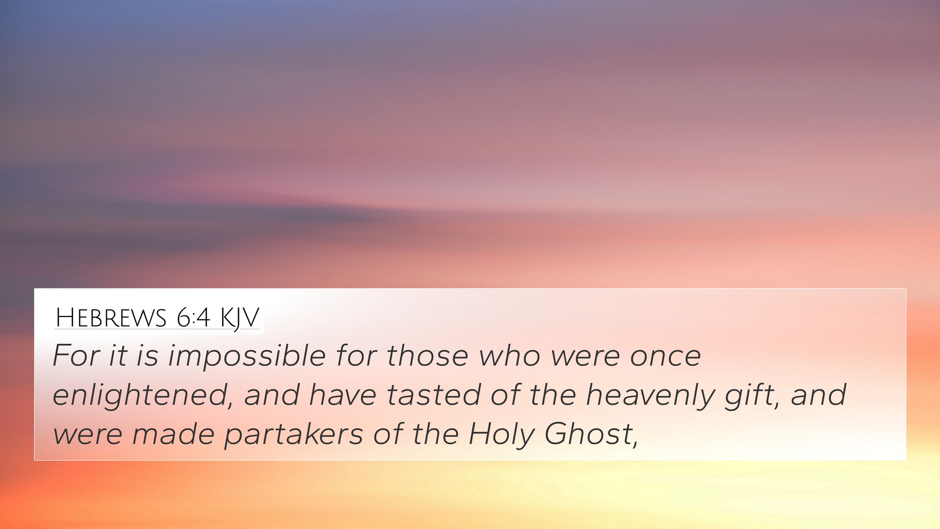 In summary, Hebrews 6:4 stands as a serious exhortation to believers to remain anchored in their faith. The combined insights from esteemed commentaries provide a rich context for understanding this critical verse. As we engage with these scriptural advisements, we are also encouraged to explore the cross-references that deepen our understanding and draw connections between various parts of the Bible. The careful study of these interrelations fosters a more profound appreciation for the complexities and the beauty of God’s word, enhancing our spiritual lives.