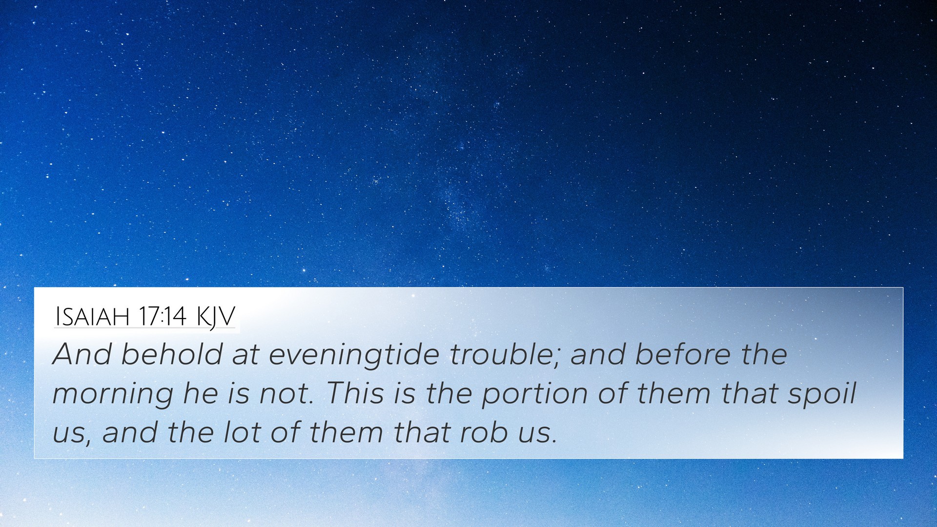 Isaiah 17:14 states, "Behold, at evening tide trouble; and before the morning he is not. This is the portion of them that spoil us, and the lot of them that rob us." This verse presents a vivid image of imminent disaster and the rapidity with which fortunes can change, serving both as a warning and a conclusion to the prophetic denunciation of the enemies of Israel.