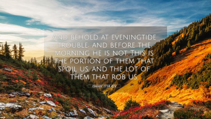 Isaiah 17:14 offers profound insights into God's sovereignty and the transient nature of human power, emphasizing that those who oppose Him will ultimately face judgment. The rich tapestry of cross-references serves to strengthen understanding, inviting deeper study and contemplation of the Scriptures.