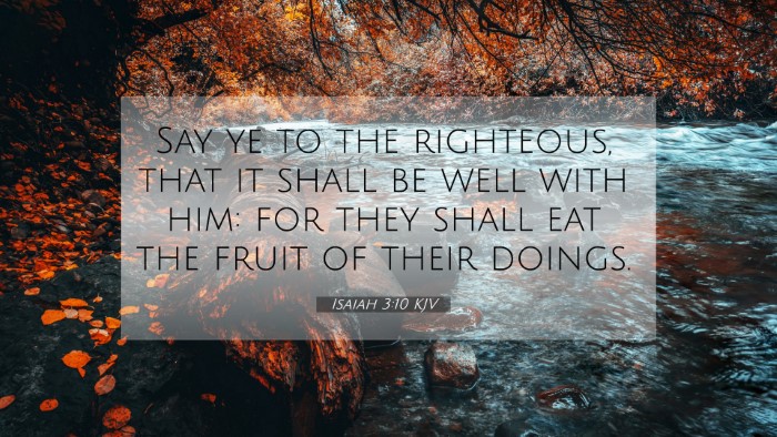 Isaiah 3:10 is a profound declaration of the assurance provided to the righteous in a world often characterized by sin and judgment. Its themes are echoed throughout the Bible, revealing the holistic message of God's commitment to bless those who pursue righteousness. By exploring the connections between this verse and others, believers can find hope and strength in their faithful walk with God. Whether one is studying individually or in a group, using Bible cross-reference tools will greatly enhance understanding and application of scriptural principles.