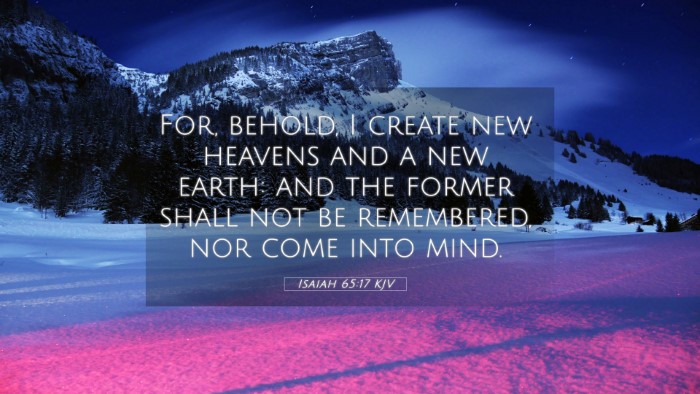 Adam Clarke posits that this new creation is not only physical but also spiritual, indicating a complete restoration of God's people. Through this new reality, believers are assured of a future where joy and righteousness prevail, showcasing God’s covenant faithfulness.