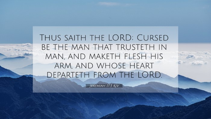 In conclusion, Jeremiah 17:5 encapsulates a profound spiritual truth about reliance on God. By examining public domain commentaries alongside cross-referenced scriptures, one can develop a holistic understanding of the importance of placing trust in the Lord. This understanding resonates with the call for believers to cultivate a deeper relationship with God rather than succumbing to human weaknesses.