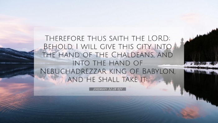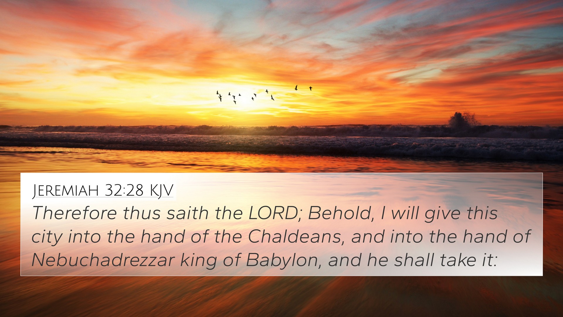 Verse: Jeremiah 32:28 states, "Therefore thus says the LORD: Behold, I am giving this city into the hand of the Chaldeans and into the hand of Nebuchadnezzar king of Babylon." This prophetic message reveals God's sovereignty and the impending judgment against Jerusalem due to its disobedience.