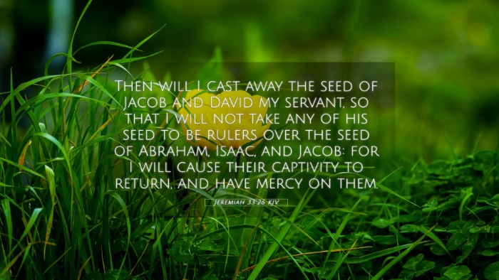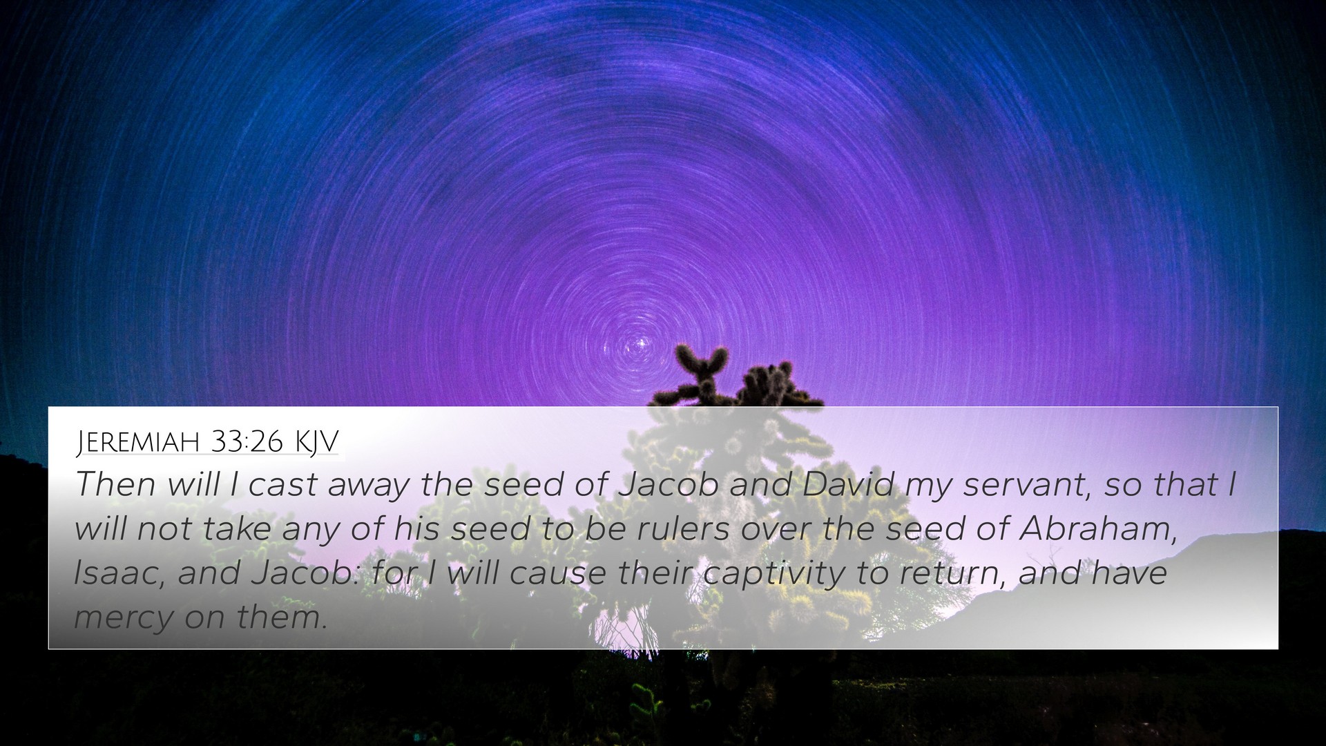 Jeremiah 33:26 serves as a powerful reminder of God’s faithfulness and His readiness to restore His people to a right relationship with Him. Through cross-referencing various Biblical texts, we gain a deeper understanding of the cohesive narrative of mercy, fidelity, and restoration that permeates scripture. The connections between this verse and others illustrate the rich tapestry of God’s promises throughout Scripture.