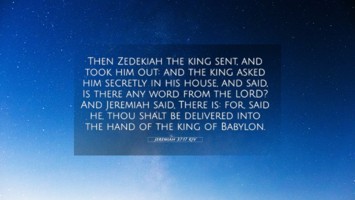 Below, you will find carefully selected verses that echo the themes and teachings related to Jeremiah 37:17 KJV. Click on any image to explore detailed analyses of related Bible verses and uncover deeper theological insights.