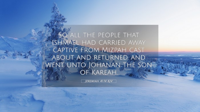 In Jeremiah 41:14, we encounter a moment of great fear underscored by previous disobedience to God, reminding us of the dire consequences that often arise in the absence of faithfulness. The verse serves as a poignant reminder of the importance of understanding the emotional and spiritual landscapes of biblical narratives, as well as fostering connections through cross-referencing to expand our comprehension of scripture.