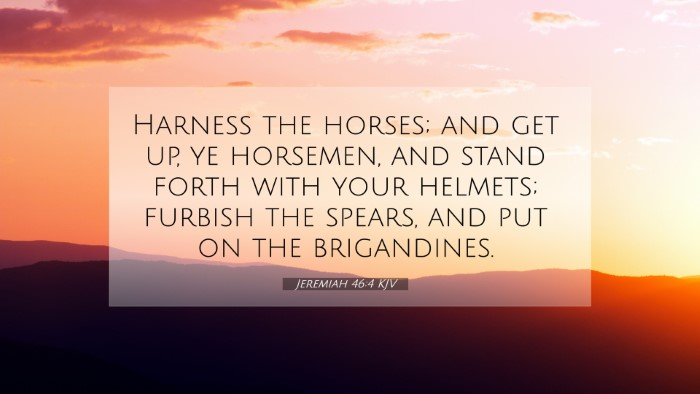 Jeremiah 46:4 serves as a profound reminder of God's ultimate authority, the nature of spiritual conflict, and the futility of reliance on human strength. Through cross-referencing this verse with others, we gain deeper insights into God's character and the overarching narrative of redemption throughout the Scriptures.