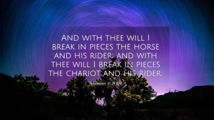 Jeremiah 51:21 provides a rich landscape for theological reflection and practical application. By examining this verse alongside various cross-references, believers can attain a deeper understanding of God’s nature and His expectations for leadership. The judgment depicted serves as both a warning and a reminder of the ultimate sovereignty of God over all nations and leaders.
